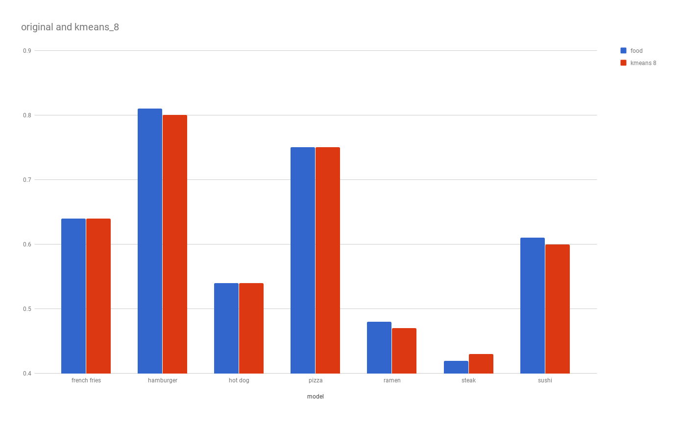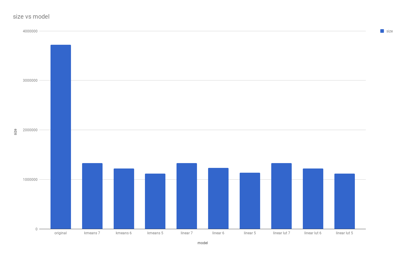 So what is the best model? Since we decided the smallest model with the least difference in accuracy against the original is our best candidate. We could argue according to our test data, that the eight bit kmeans quantized model with a reduction of 61% in size and an average of 0.5% reduction in accuracy is the best choice.