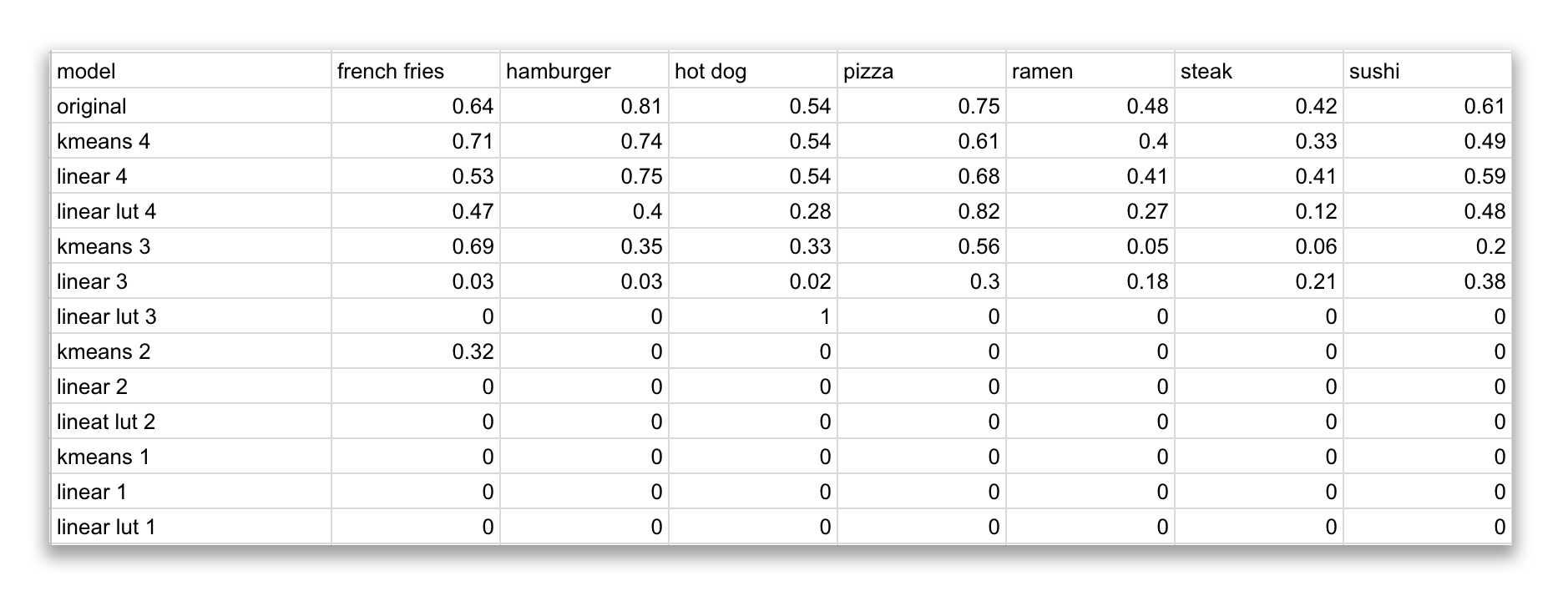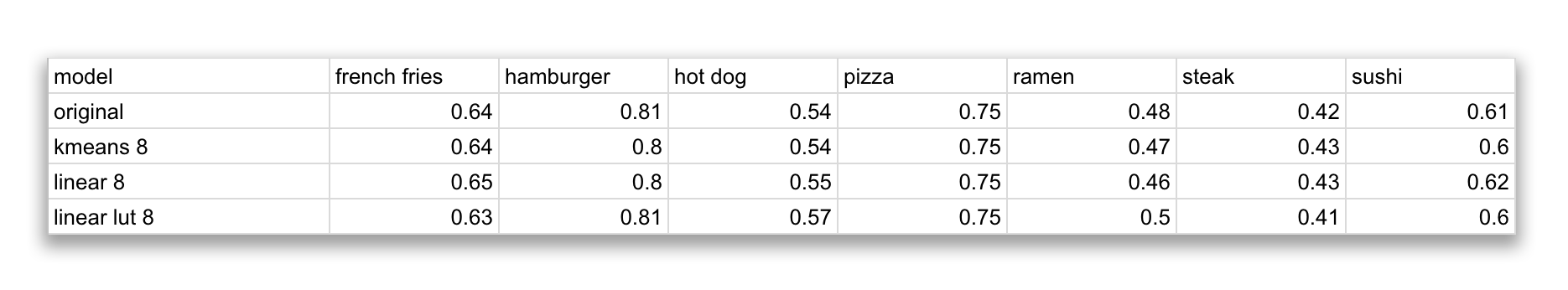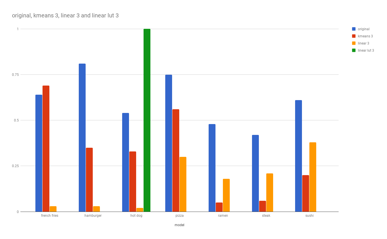 Of course looking at the charts, you might be tempted to use the three bit linear lut model for your hotdog detection. What's better than a model that has a 100% accuracy rate for hot dog? Well this chart might be a bit misleading as this model thinks EVERYTHING is a hot dog. Hence why its accuracy for everything else is at a 0%. As mentioned earlier the quality of the model is not dependent on its specific category detection but an aggregate of how it performs against all categories being tested.