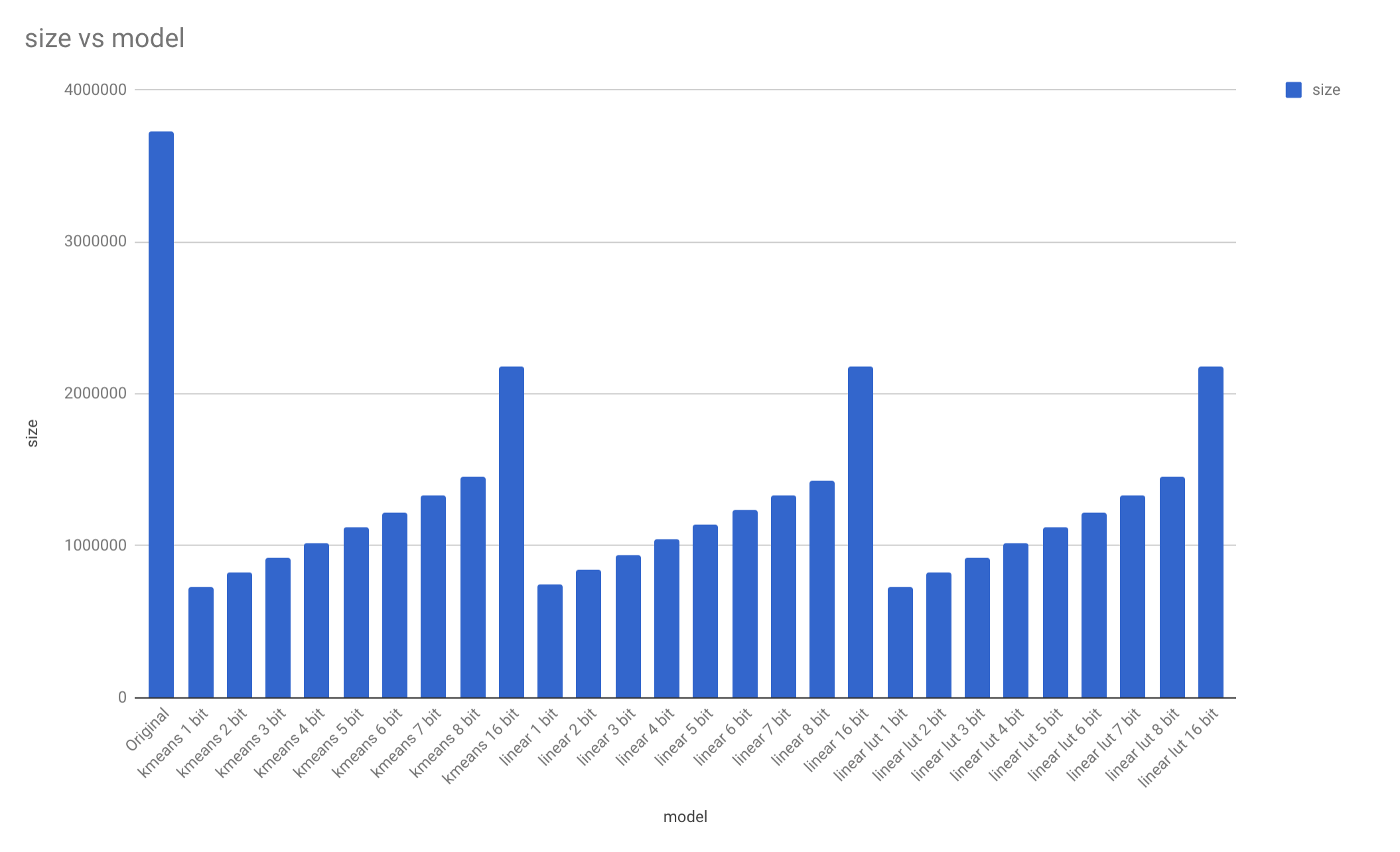 In less than ten minutes, we’re proud owners of 27 new models, all in different sizes. We can see that quantization can result in a substantial reduction in size. All quantized models are substantially smaller than the full precision model.