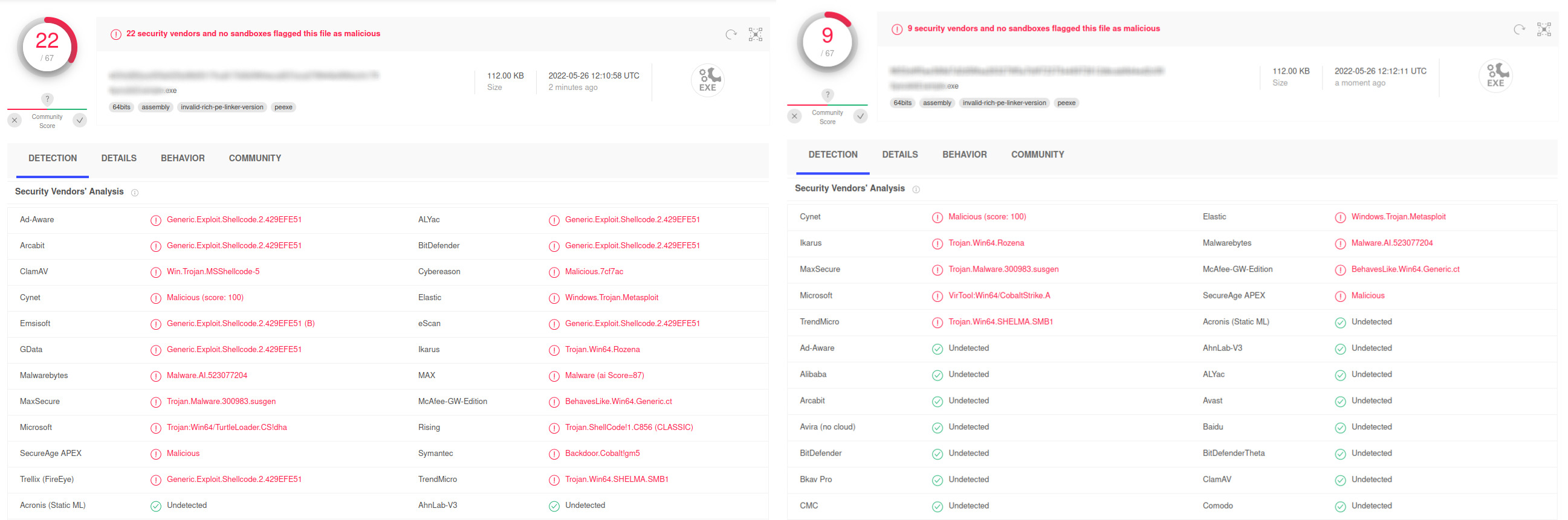 High-Entropy (left side) vs Low-Entropy (right side) default CS Shellcode integrated with Syscalls (Syswhispers2):