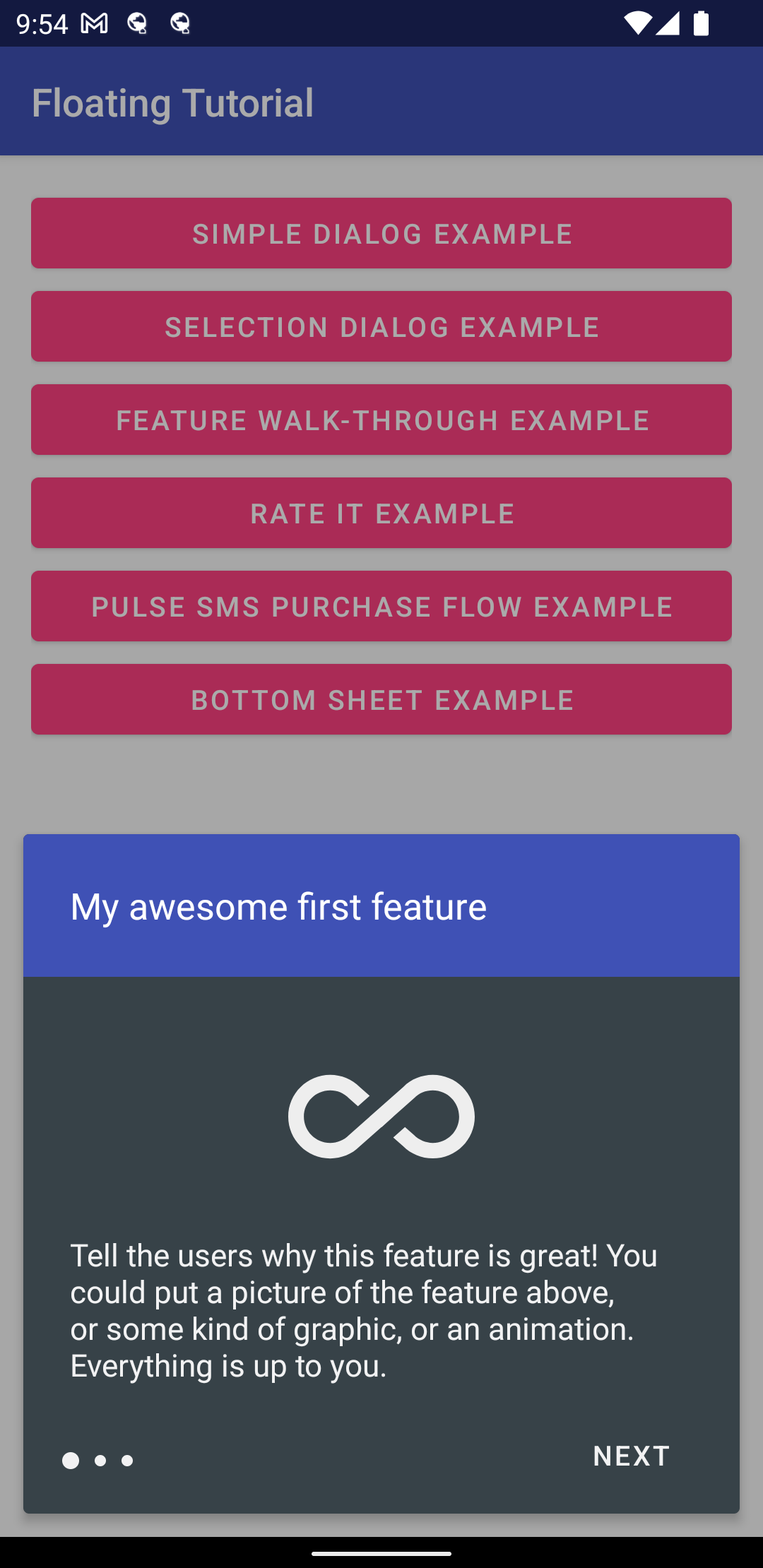 BottomSheetTutorialPage, it will present your floating tutorial at the bottom of the screen. I found that this works better and looks better for some use-cases and page UIs.