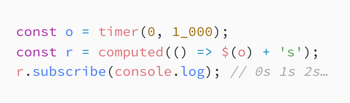 o.next('π'); // > πrecompute c with latest a and b, only when b updates