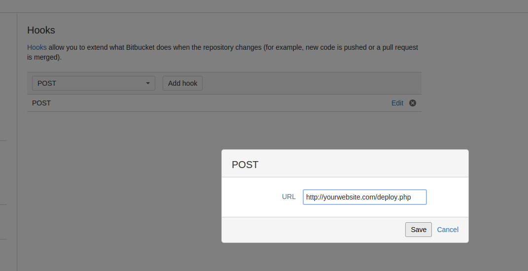 - Bitbucket: goto https://bitbucket.org/user/repo/admin/hooks, select "POST" option in the select box, click on "Add hook", parte your URL to deploy.php file and click on "save"