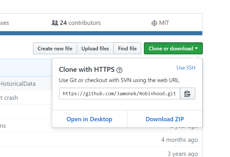In order to run even Ruth, the user must be set up to work with the Robinhood API. The first step in that is creating an account. Once that's done, the user must get the wrapper to interact with the API from Jamonek's repository. In Git, navigate to inside the "Redeemer" folder path, and then clone the repository. Click on this link and then click on the green button to the right which says "Clone or download v", then copy the address which the dropdown menu supplies.