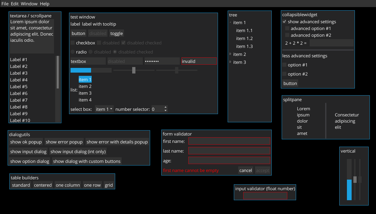 VisUI allows to create nice looking UI in libGDX using scene2d.ui. Library contains scene2d.ui skin, useful widgets like color picker and file chooser, it also contains modified scene2d.ui widgets to provide some extra functionality like focus borders, background change on over and click, etc.