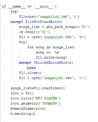 ->created a class named mainframe to handle play,next song, previous song, pause (buttons) and used some tkinter methods.