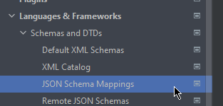 Download file with schema. Open preferences File->Preferences In Languages & Frameworks > Schemas and DTDs > JSON Schema Mappings