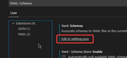 Open Schema Settings by typing YAML:Schemas and click on Edit in settings.json