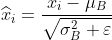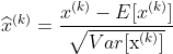 $${\widehat x^{(k)}} = {{{x^{(k)}} - E[{x^{(k)}}]} \over {\sqrt {Var[{{\rm{x}}^{(k)}}]} }}$$