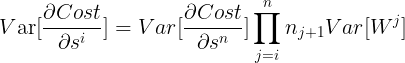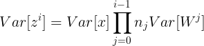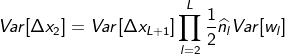 $$Var[\Delta {x_2}] = Var[\Delta {x_{L + 1}}]\prod\limits_{l = 2}^L {{1 \over 2}\widehat {{n_l}}Var[{w_l}]} $$...........................................................(9)