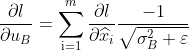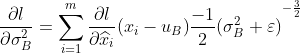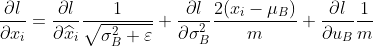 • $${{\partial l} \over {\partial {u_B}}} = \sum\limits_{{\rm{i = 1}}}^m {{{\partial l} \over {\partial {{\widehat x}_i}}}} {{ - 1} \over {\sqrt {\sigma _B^2 + \varepsilon } }}$$