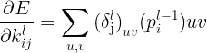 • 所以卷积核权值的梯度为:$${{\partial E} \over {\partial k_{ij}^l}} = \sum\limits_{u,v} {{{(\delta {\rm{j}}^l)}{uv}}(p_i^{l - 1})uv} $$ (其中:$${p_i^{l - 1}}$$$${{\rm{x}}_i^{l - 1}}$$中在卷积运算中逐个与$${k_{ij}^l}$$相乘的patch,因为权重的系数就是对应的patch,对权重求导,就是这个系数)