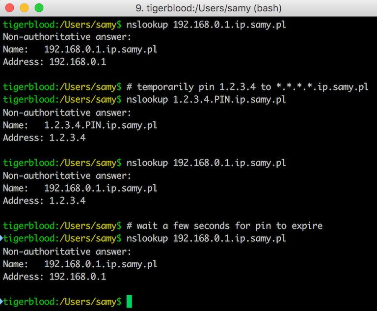 - [ip.addy].pin.ip.samy.pl temporarily (~5 seconds) points *.ip.samy.pl to [ip.addy]