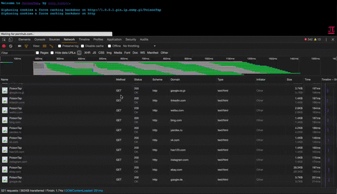 - PoisonTap then quickly sets a backdoor on http://192.168.0.1.ip.samy.pl/PoisonTap, which for the moment points to the PoisonTap device at 1.0.0.1, allowing the backdoor to be accessed and cached from the PoisonTap device