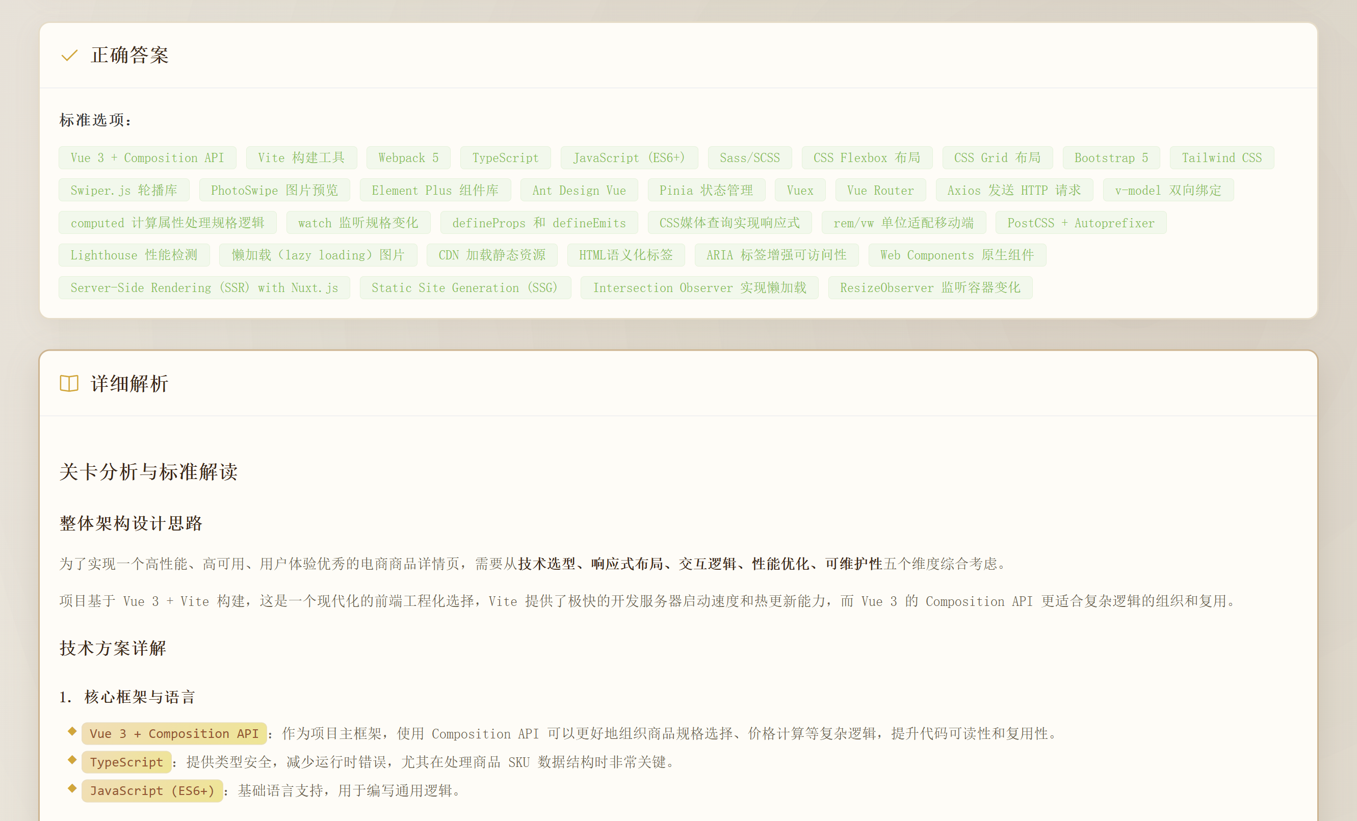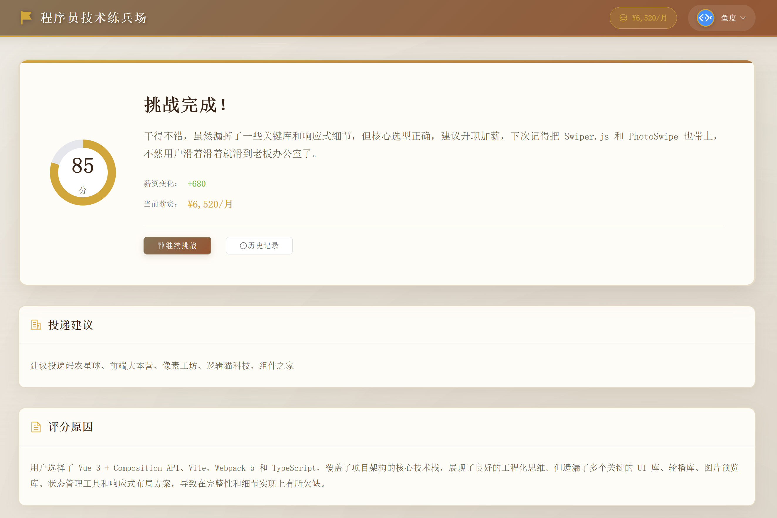 4)智能结果报告:AI 生成详细的闯关报告,包括分数评价、薪资调整、投递建议、技术解析、架构图、流程图、学习建议和面试题推荐。