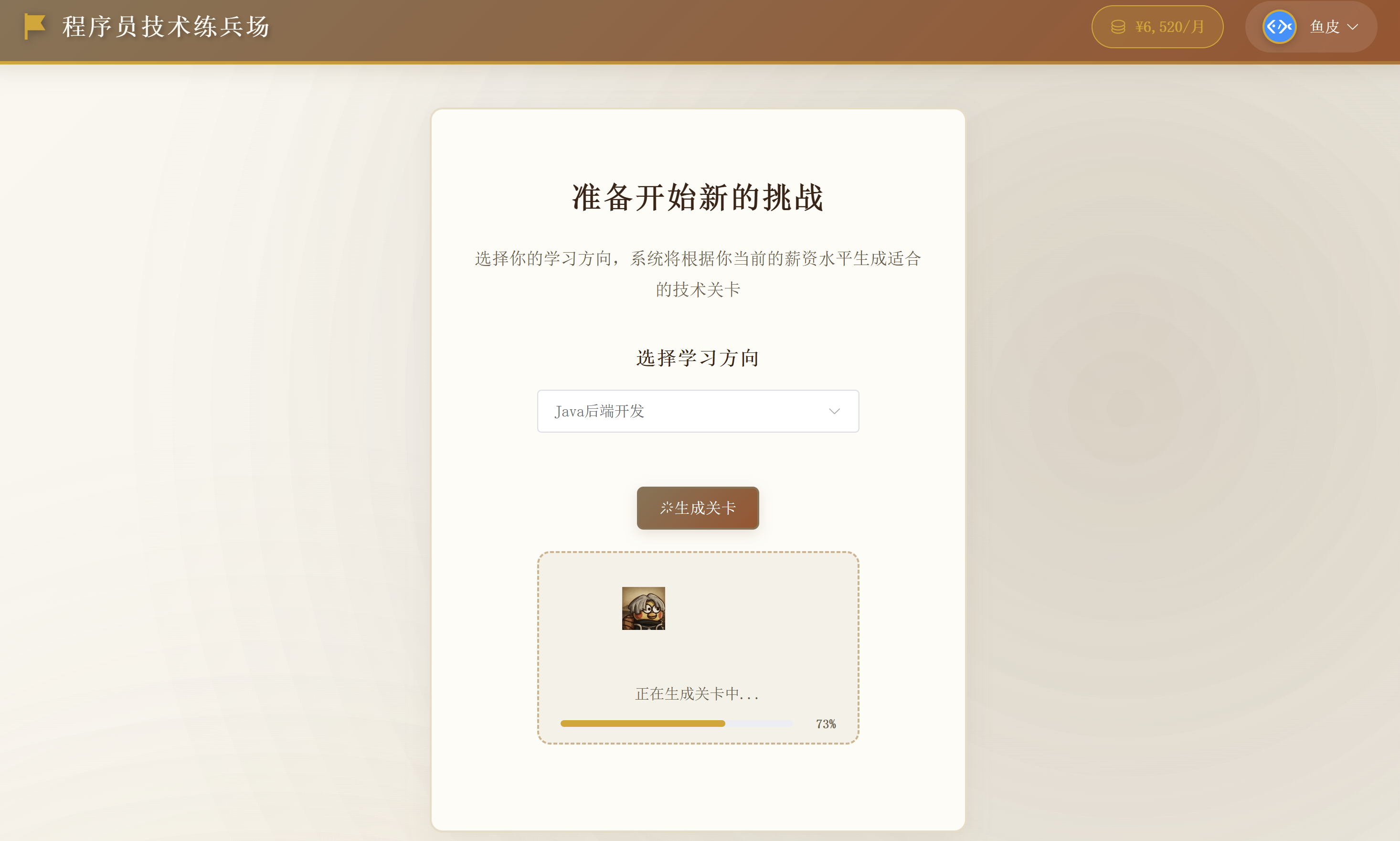 1)AI 智能生成关卡:基于用户当前薪资和学习方向,AI 动态生成真实企业场景的技术挑战,支持前端、Java后端、Python后端、软件测试、AI算法、网络运维等多个技术方向。