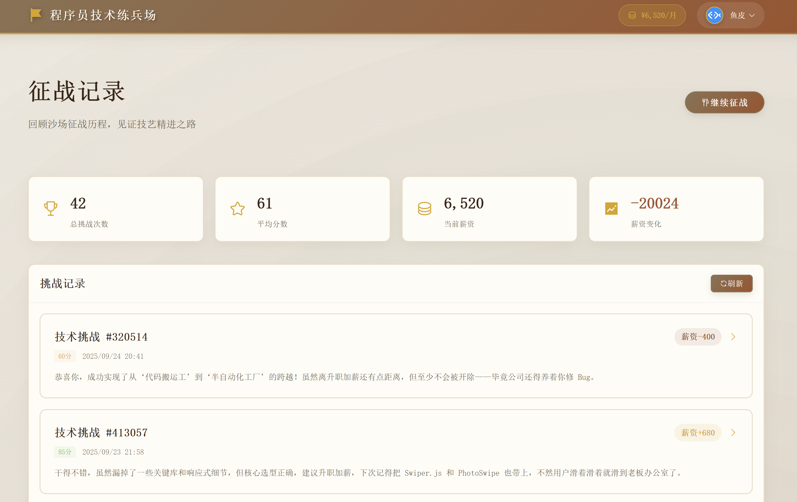 5)历史记录追踪:完整记录挑战历史和成长轨迹,支持薪资变化可视化展示。