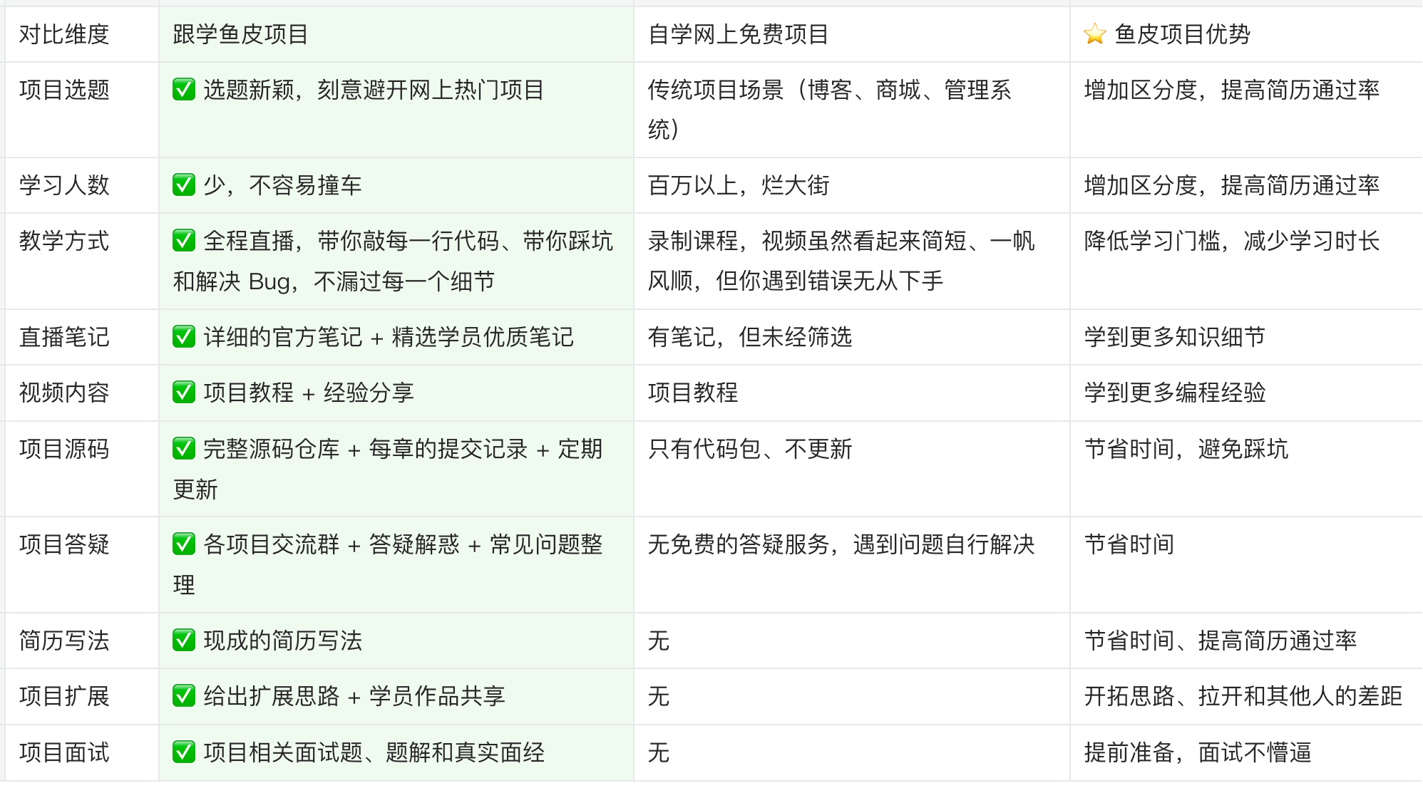 比起看网上的教程学习,鱼皮项目系列的优势:从学知识 => 实践项目 => 复习笔记 => 项目答疑 => 简历写法 => 面试题解的一条龙服务