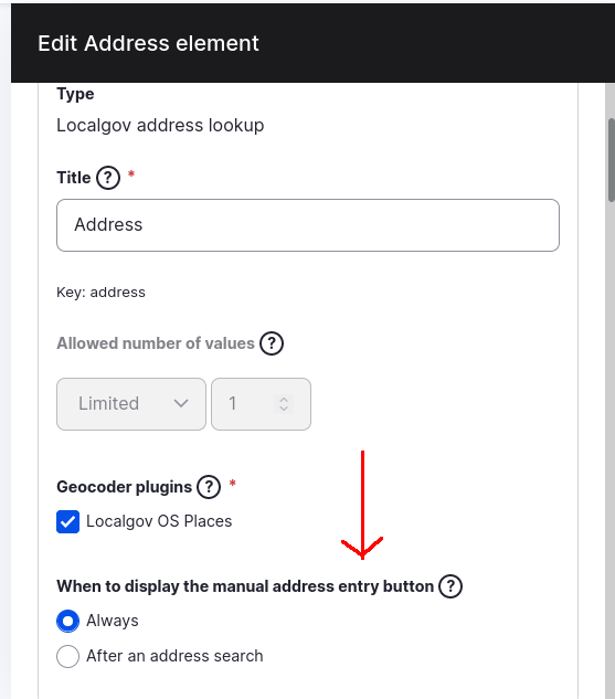 By default, the manual address entry button will continue to appear as soon as the LocalGov address lookup element is loaded.