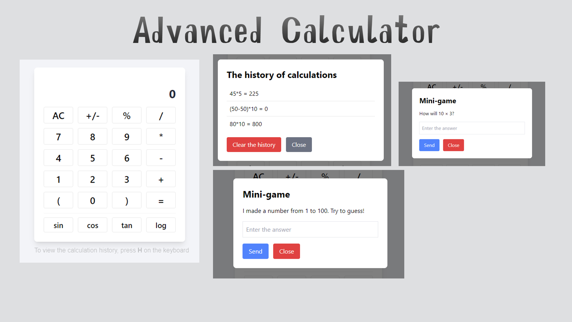 This calculator is not just a calculation tool. It offers users an intuitive interface for performing mathematical operations, and also contains several hidden functions and mini-games that can be unlocked using secret codes.