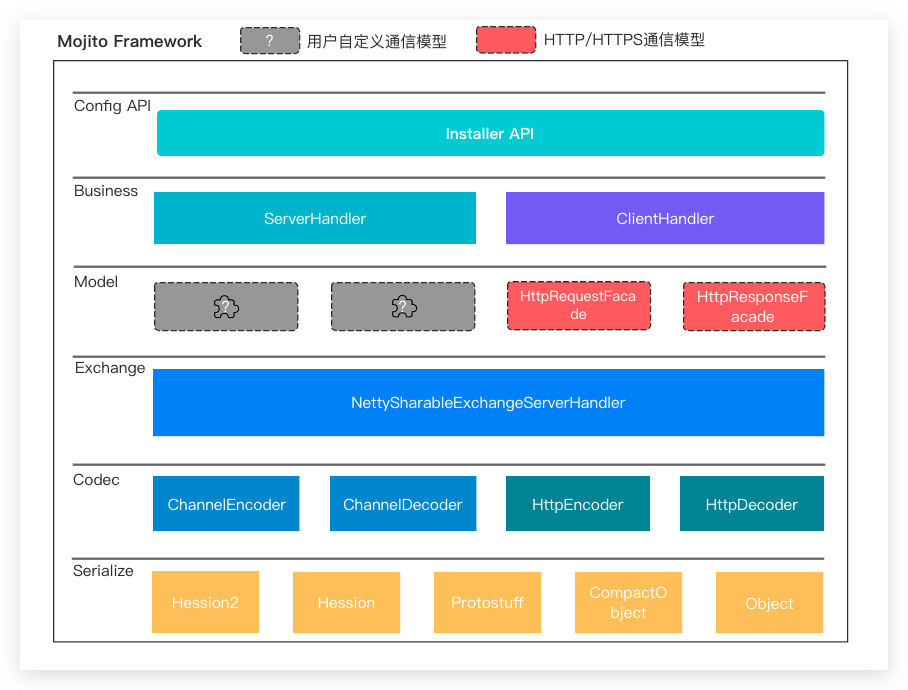 mojito的定位是通信层框架,其本质是基于Netty进行二次封装,提供更加简单的API,方便开发者进行调用。 如果你要写一个通信类的组件,但是又不希望引入web容器,或者rpc之类的框架。此时mojito就是最佳选择,因为它提供非常简单API可以快速的构建通信模块,代码量缺只有一点点的样子。当然如果你对Netty比较熟悉,也可以直接使用Netty进行开发。 更多关于Mojito的定位