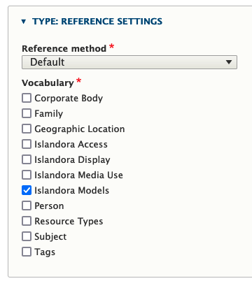 Set Type Reference Settings to pull from Islandora Models vocabulary (for testing only, since that one is populated out of the box)