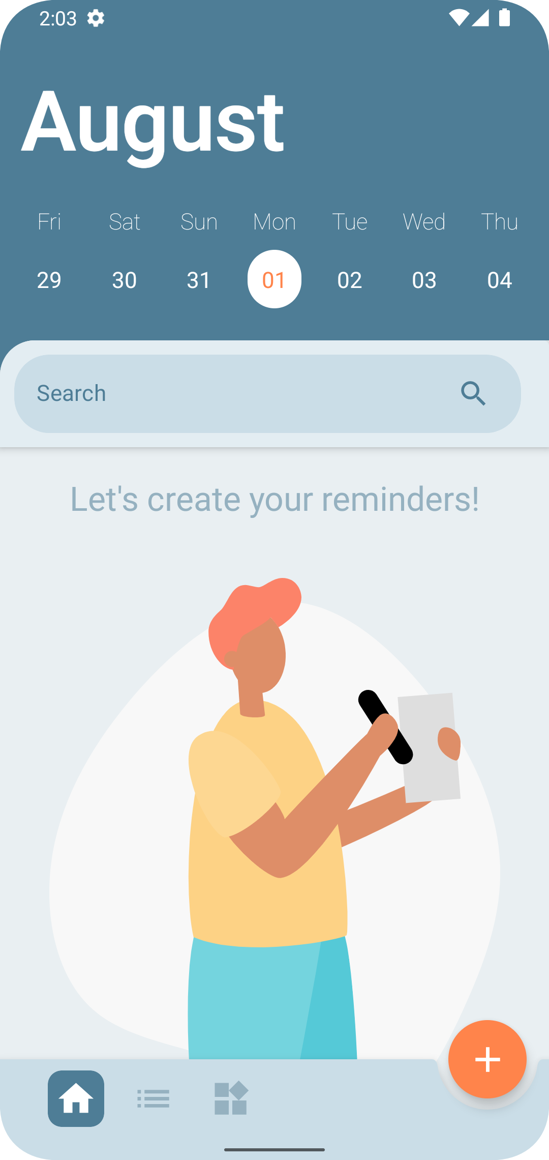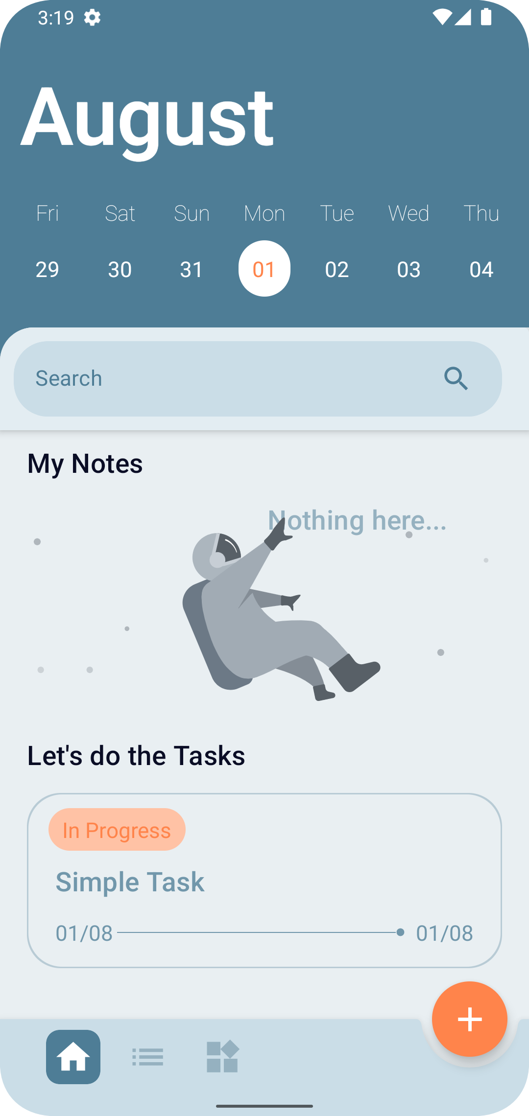 <--- Start page view (presentation of the calendar, empty states and tasks)