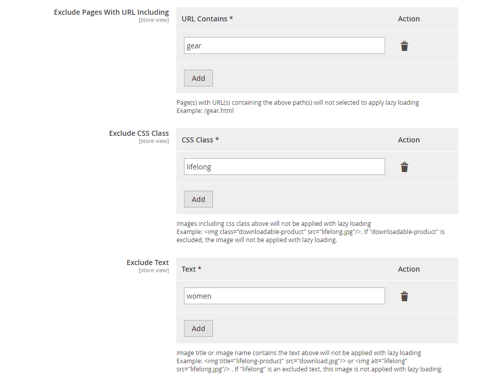 - Exclude Pages With URL Including: Click Add button to enter the path of the page that you do not want to apply lazy loading. Pages with URLs entered in this field will not apply lazy loading. Click Delete icon to delete the path you have just entered.