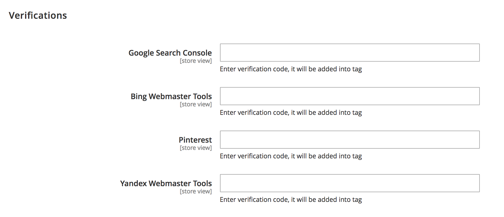 In the Verification field, you need to enter the verification code to confirm the ownership of your site. Hence, you can use the Web services such as Google Search Console, Bing Webmaster Tools, Pinterest and Yandex Webmaster Tools.