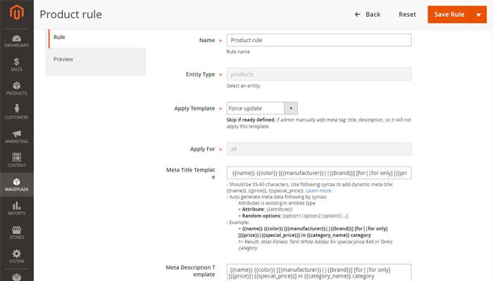 - Metadata template rules for products, categories, cms pages