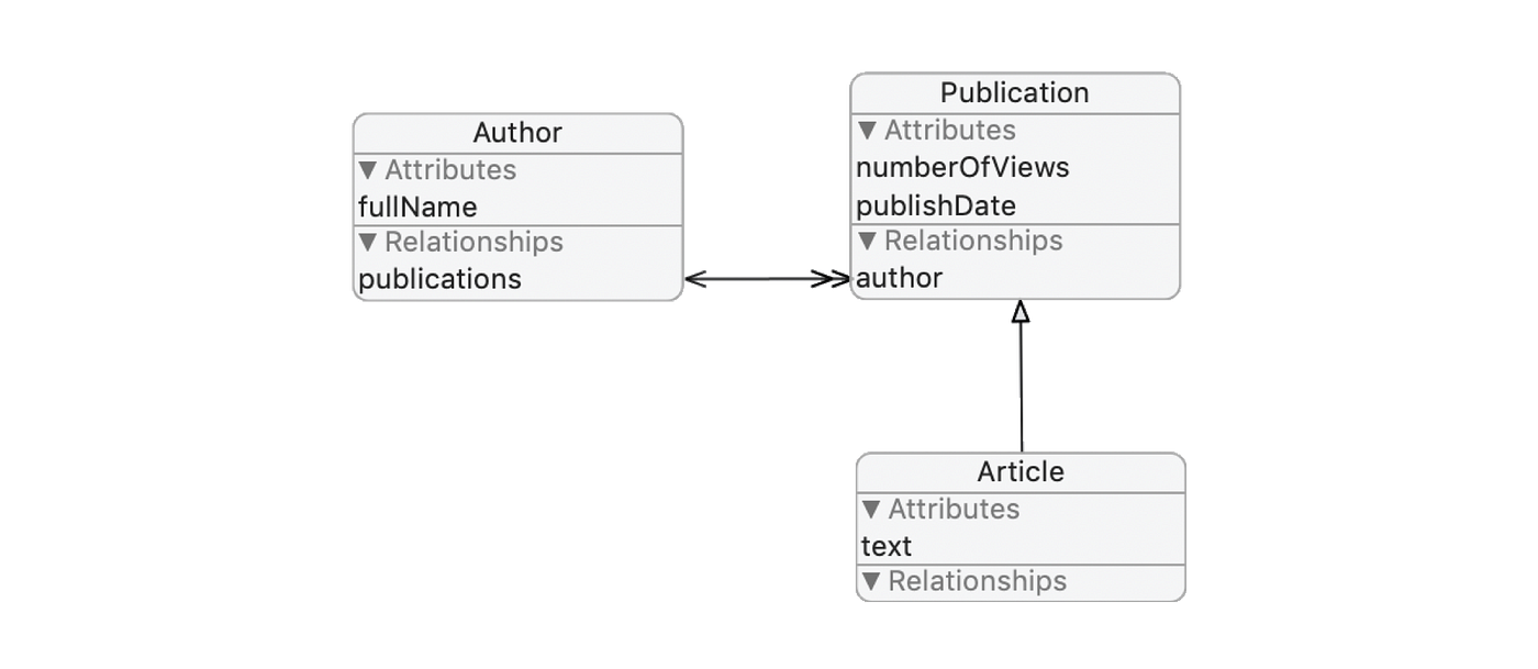 Assuming you already defined Author, Publication, and Article subclasses of NSManagedObject.