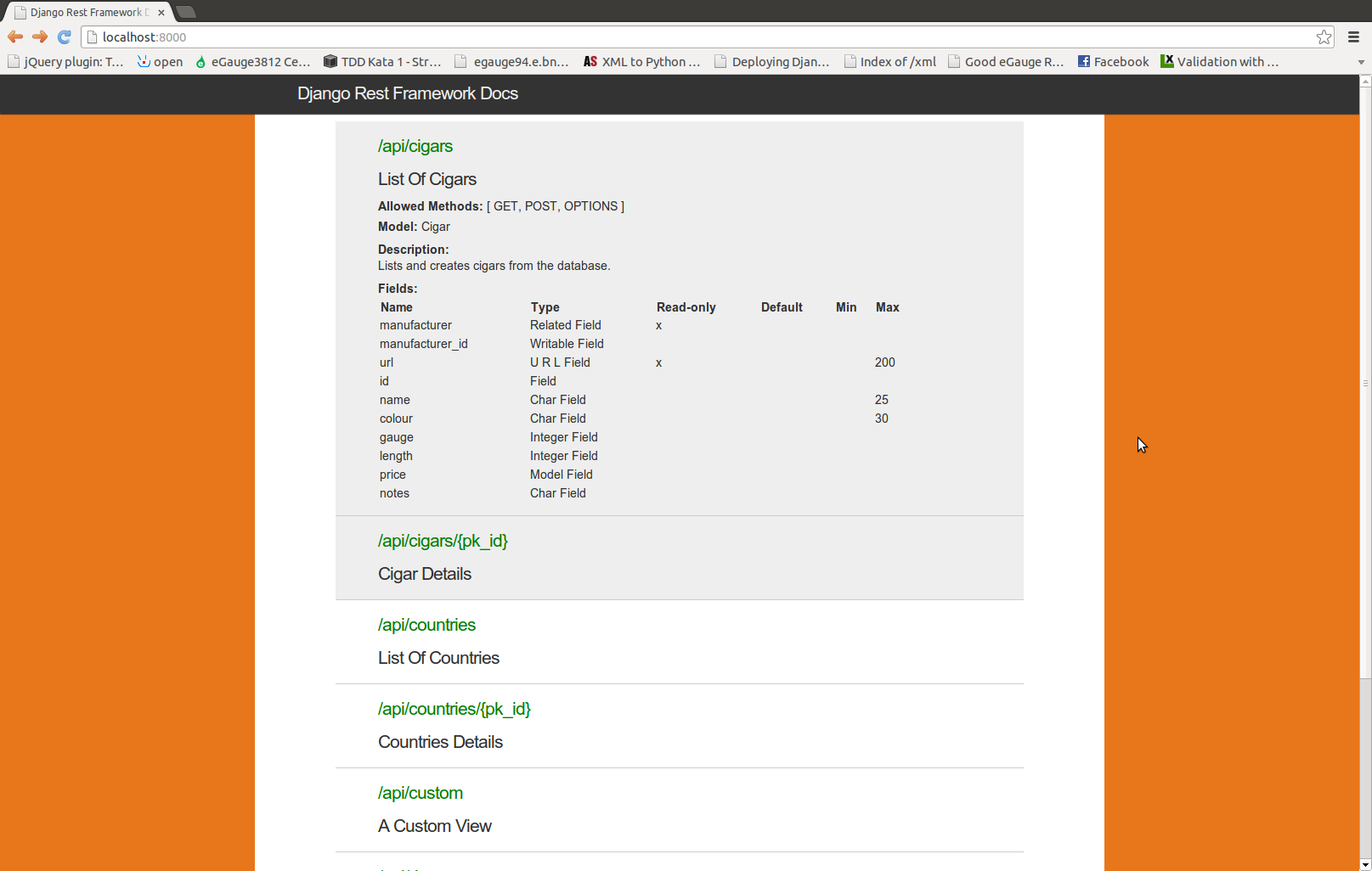 docs = DocumentationGenerator(urls.urlpatterns).get_docs()Included is an example project called cigar_example. It contains both Model-based