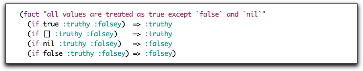 Here's the same fact about Clojure in Midje, expressed in a way that's just as readable but also machine-checkable:
