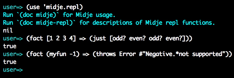 Midje is a test framework for Clojure. I created it to allow programmers to test with ease, to provide a smooth migration path from clojure.test, to support top-down as well as bottom-up testing, to encourage readable tests, to support a balance between abstraction and concreteness, and to be gracious in its treatment of the people who use it.