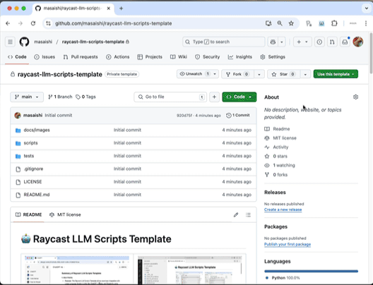 This repository provides a template for creating Raycast scripts that integrate with popular LLMs (ChatGPT, Claude, and Perplexity) without requiring API keys. Simply write Python scripts with prompt templates, and launch your favorite LLM in the browser with pre-filled prompts.