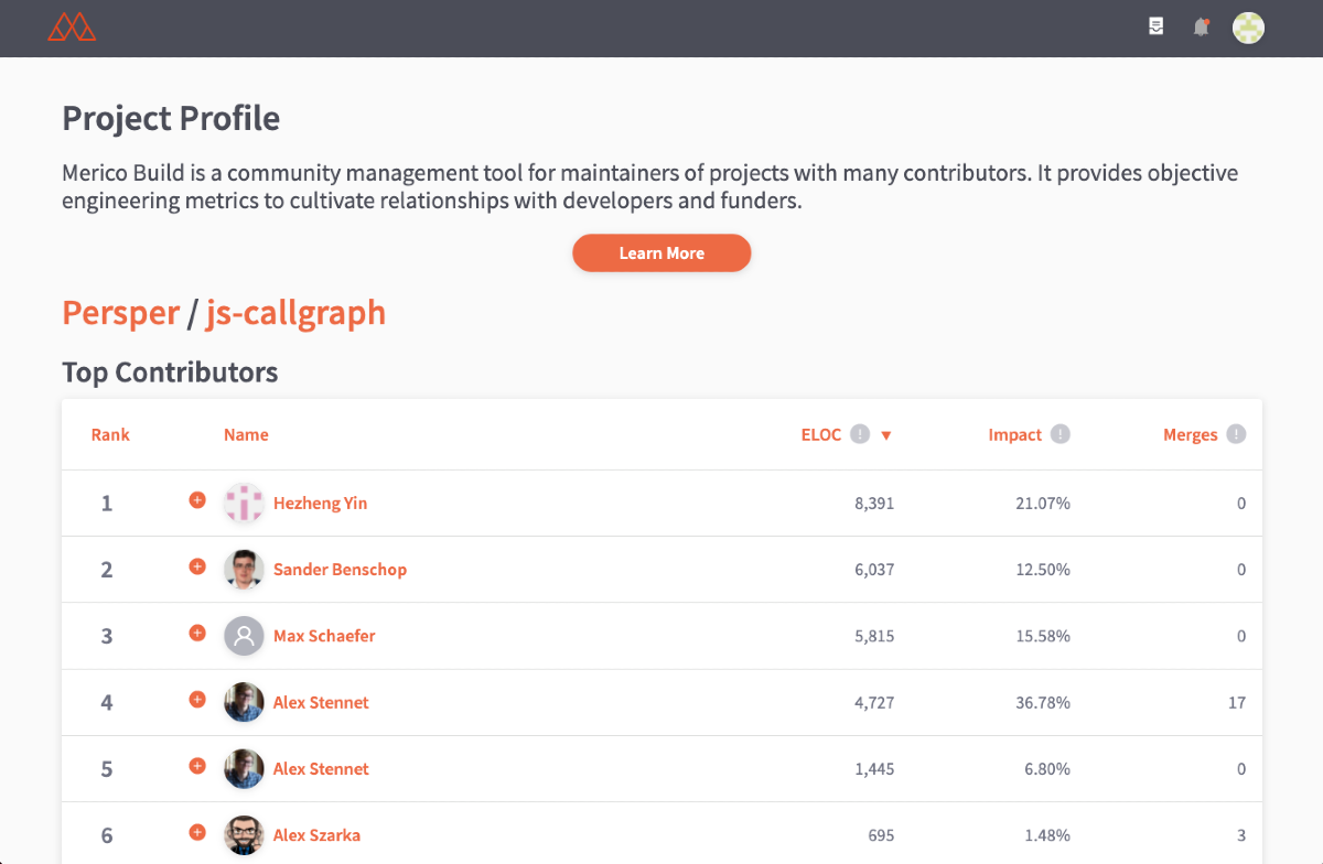 Merico Build is a web app empowering open source developers, maintainers, and communities with metrics from Git, GitHub, and more. The application uses novel static analysis to more accurately measure the value and impact of code contribution.