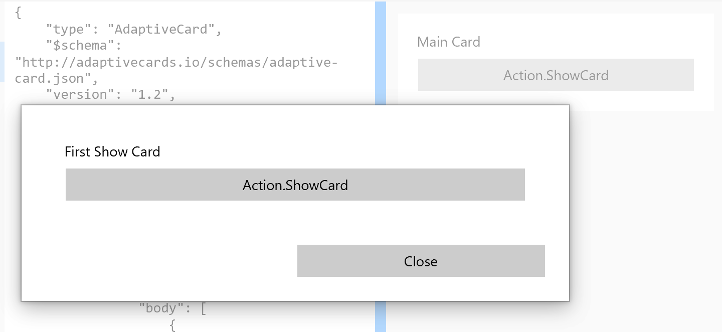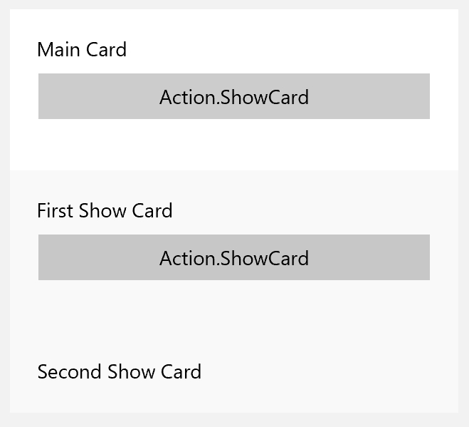 Using the below card, and setting the host config to popup mode, the nested show cards do not work. The first card is shown in a popup, but when the Action.ShowCard button is pressed in the popup, nothing happens.
