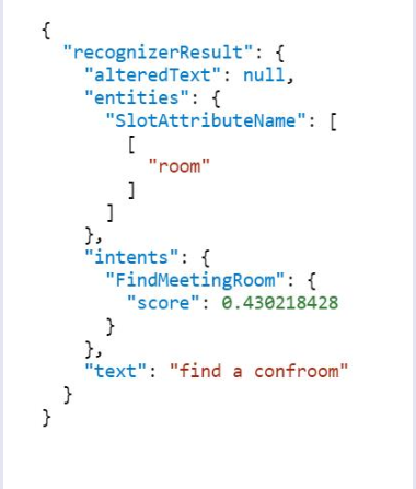 I got the predict result from luis portal with all intents and instance data: “{"query":"find a confroom","prediction":{"topIntent":"FindMeetingRoom","intents":{"FindMeetingRoom":{"score":0.430218428},"None":{"score":0.09387313},"CreateMeeting":{"score":0.0279416535},"AcceptMeeting":{"score":0.00673450669},"ShowNextMeeting":{"score":0.00178787776}},"entities":{"SlotAttributeName":[["room"]],"$instance":{"SlotAttributeName":[{"type":"SlotAttributeName","text":"confroom","startIndex":7,"length":8,"modelTypeId":5,"modelType":"List Entity Extractor","recognitionSources":["model"]}]}}}}”
