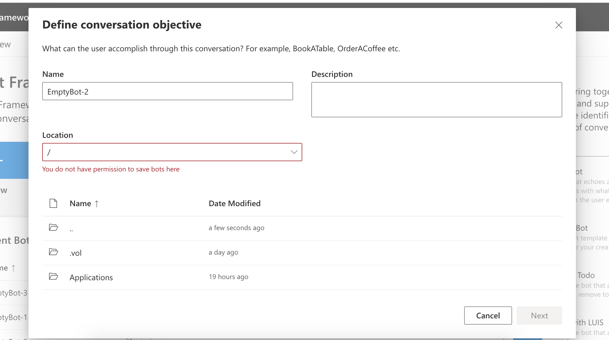 One more issue on the reverted Pr is when we create a bot on an unwritable directory. The app will crush.