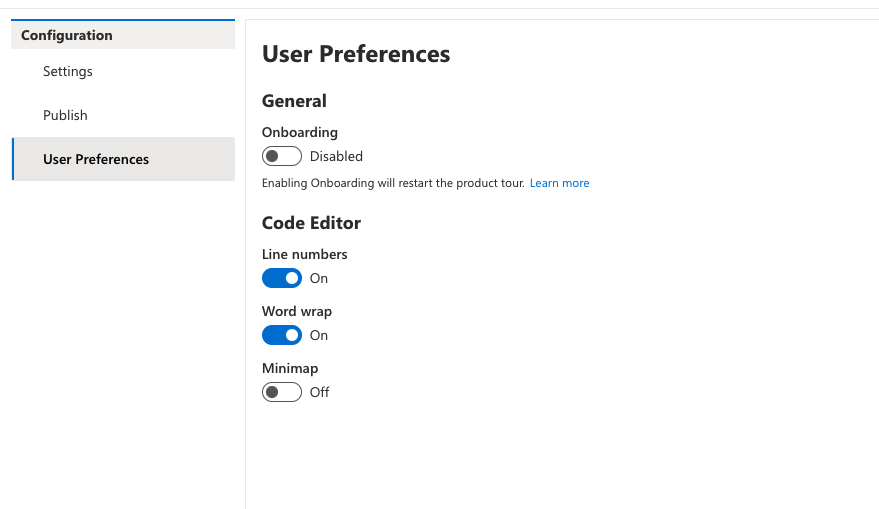 * set up code editor options in client store * add ability to change editor options at runtime * add codeEditorSettings to shell data * wire up code editor settings to lg/lu editors * add userSettings namespace * add ability to resize property editor * allow changing settings in all up views * add minimap to code editor settings * remove settings cog * move code editor settings to preferences page * add ability to change dialog nav width * remove unused import * fix up settings routes * remove dead code * update lockfile * fix onboarding e2e spec * remove cy.wait in favor of asserting on the url * add additional assertion to wait for homepage to load Co-authored-by: Chris Whitten <christopher.whitten@microsoft.com>