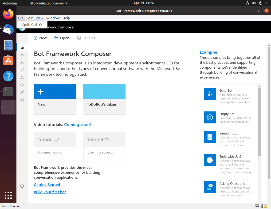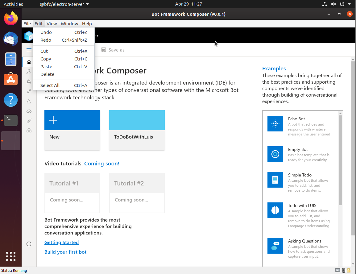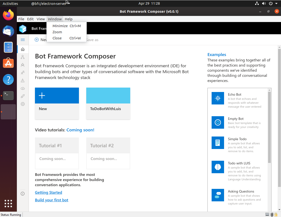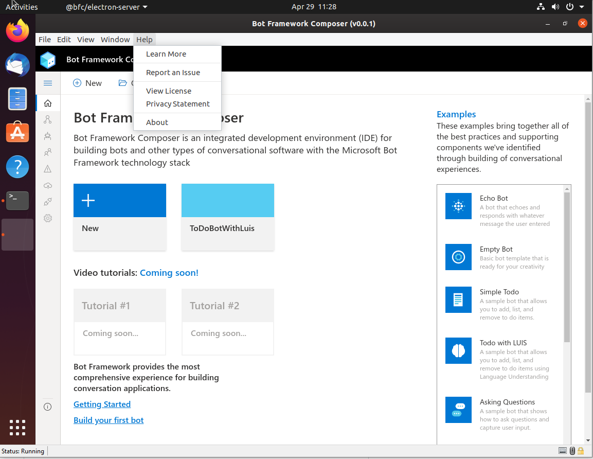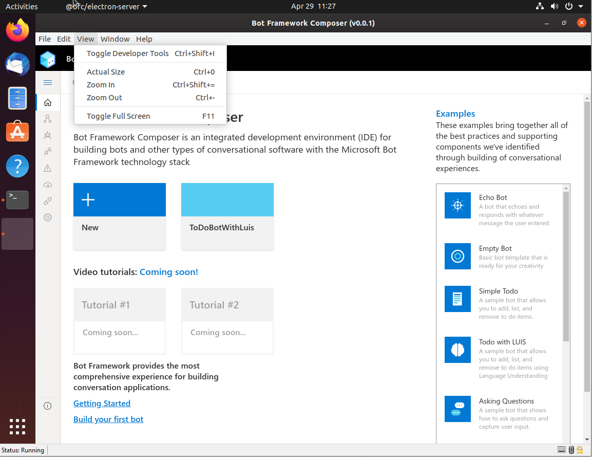 Things look good except for the Electron menu item. See attached. Can we clean this up? Can we also add a link in the help menu jumping out to the Composer docs? https://docs.microsoft.com/en-us/composer/ |
