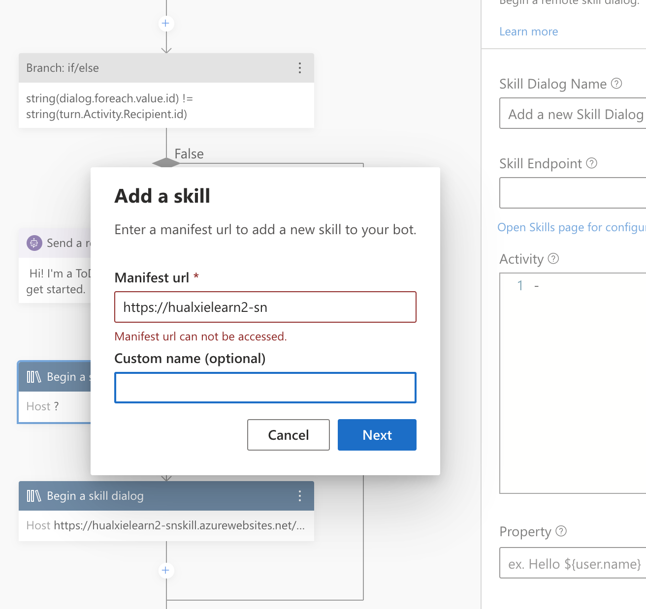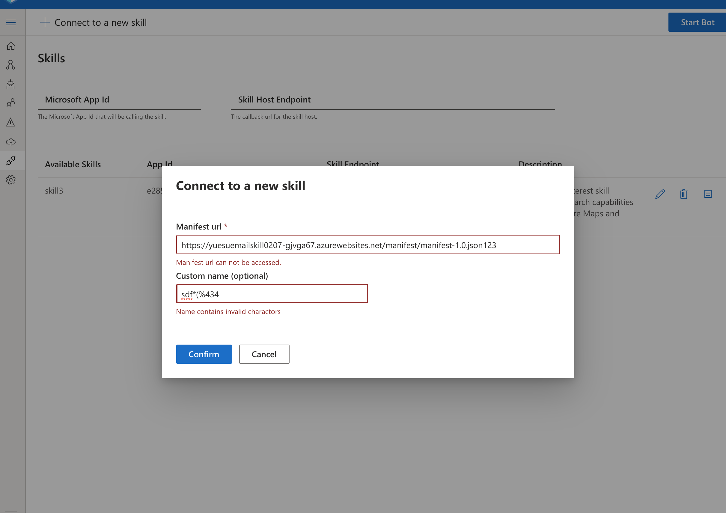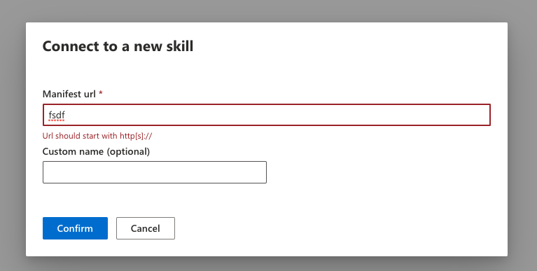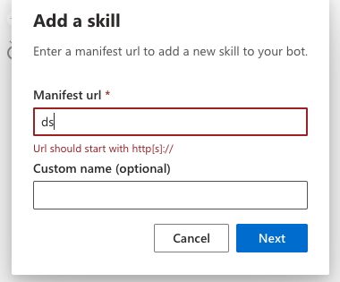 …oft#2935) * throw error when skill manifest url can not be accessed * check skill manifest url before commit * update * use createSkillModal component * clean up * separate async/sync validation * clean up * remove dead code * check status code when fetching manifest * extract manifest url validation * clean up Co-authored-by: Chris Whitten <christopher.whitten@microsoft.com> Co-authored-by: Andy Brown <asbrown002@gmail.com>