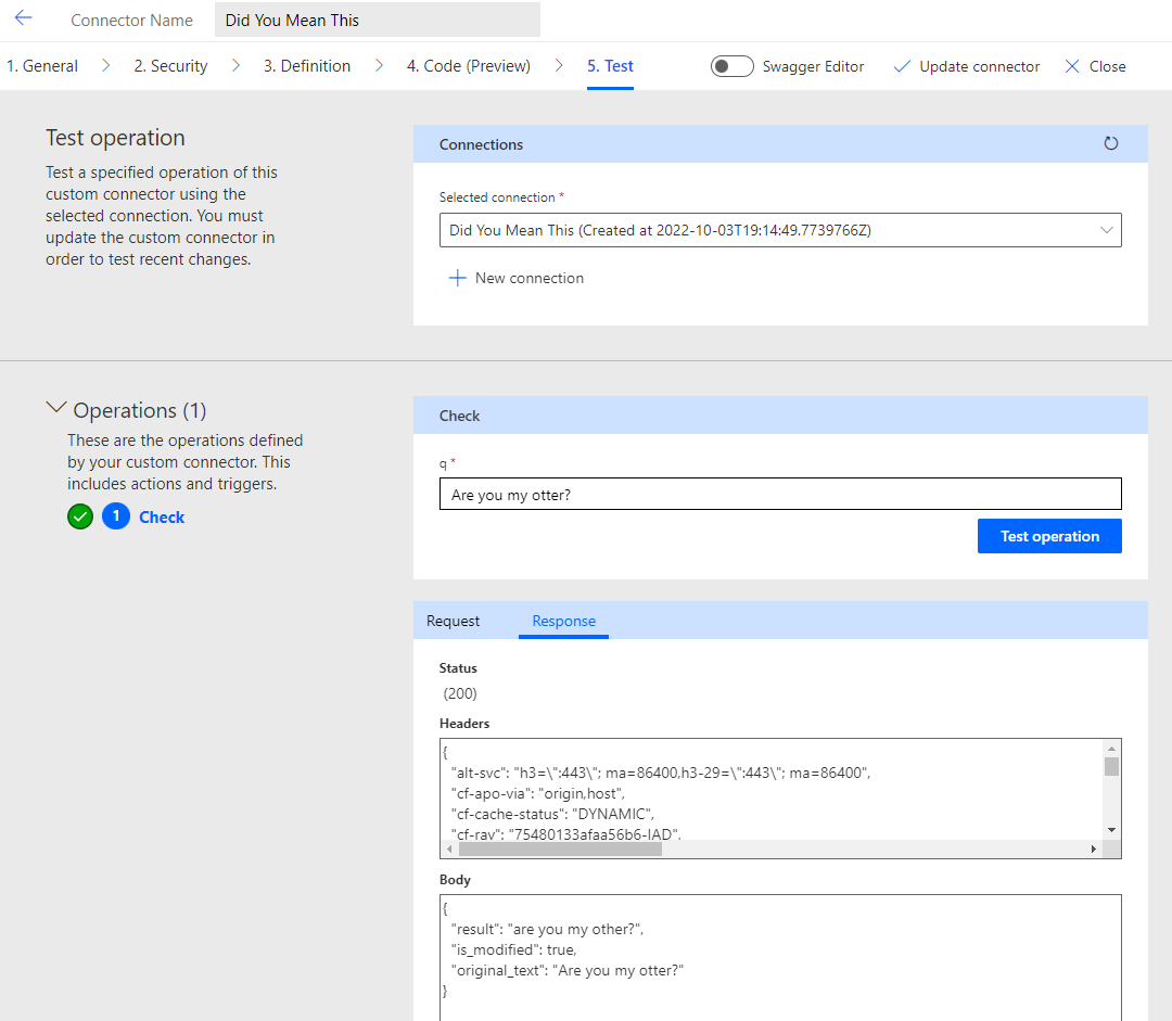 apiDefinition.swagger.json, by runningpaconn validatecommand.apiProperties.jsonhas a valid brand color and doesn't use an invalid brand color,#007ee5or#ffffff. If this is an independent publisher connector, I confirm that I am not submitting a connector icon.If you are an Independent Publisher, you must also attest to the following to ensure a smooth publishing process: