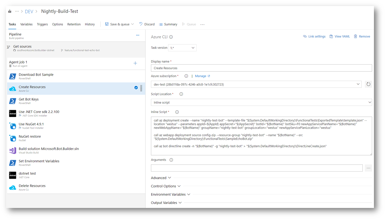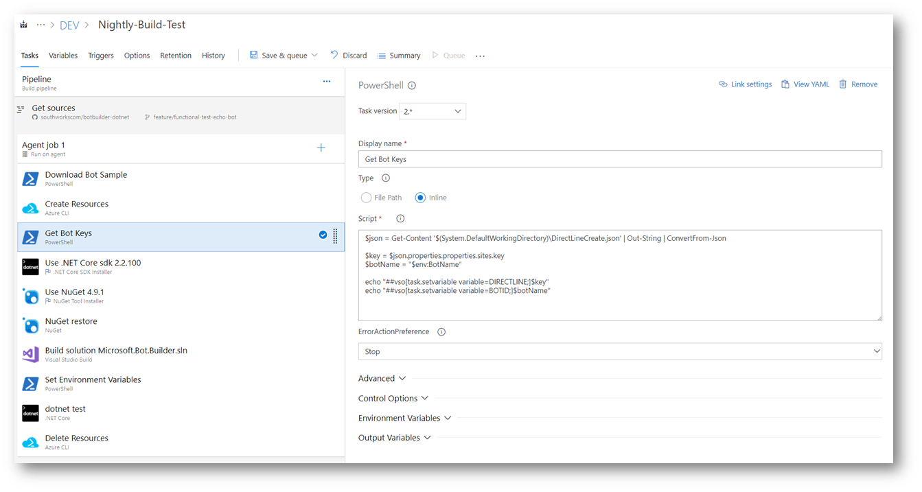 4- Add a new PowerShell Script Task to read the json file generated in the previous step and get the secret key to connect to the bot. It also sets an environment variable with this value.