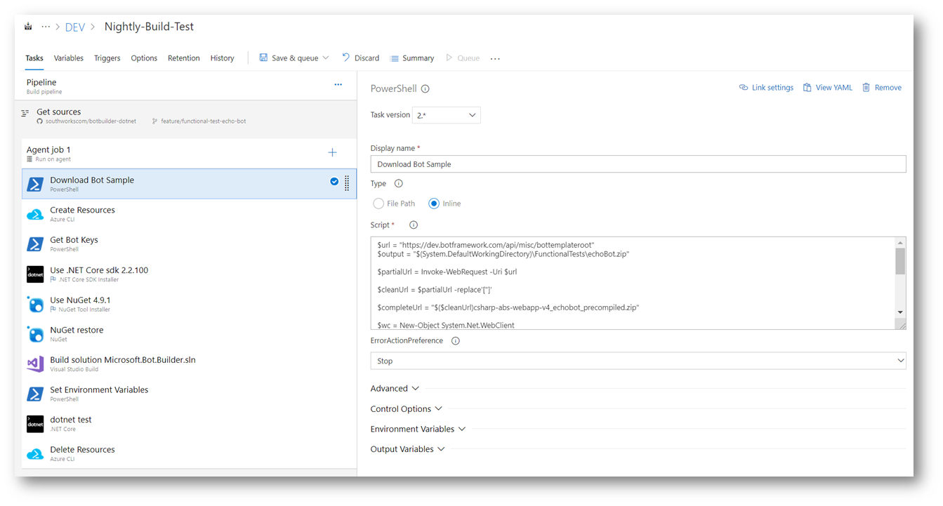 2- Add a PowerShell Script Task to download the .zip that contains the latest version of the EchoBot Sample.