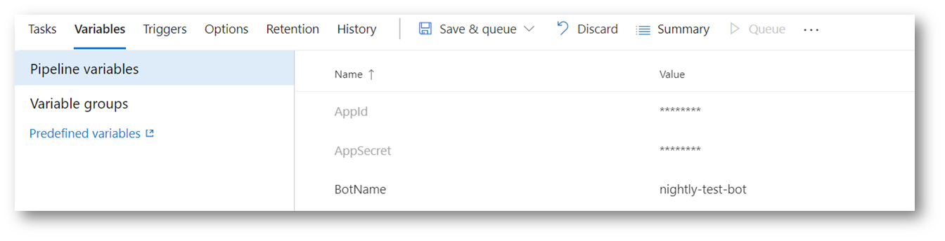 1- Define three environment variables: AppId, AppSecret and BotName and mark the first two as Secrets.