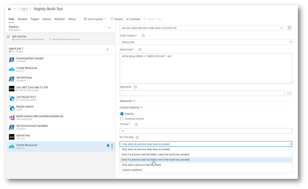 We strongly recommend setting this task to run Even if a previous task has failed, even if the build was canceled. With this setting, we will assure that the resources will be deleted from Azure even if the build fails at any step.