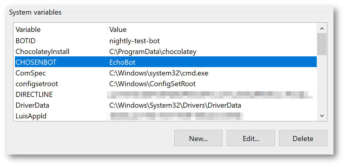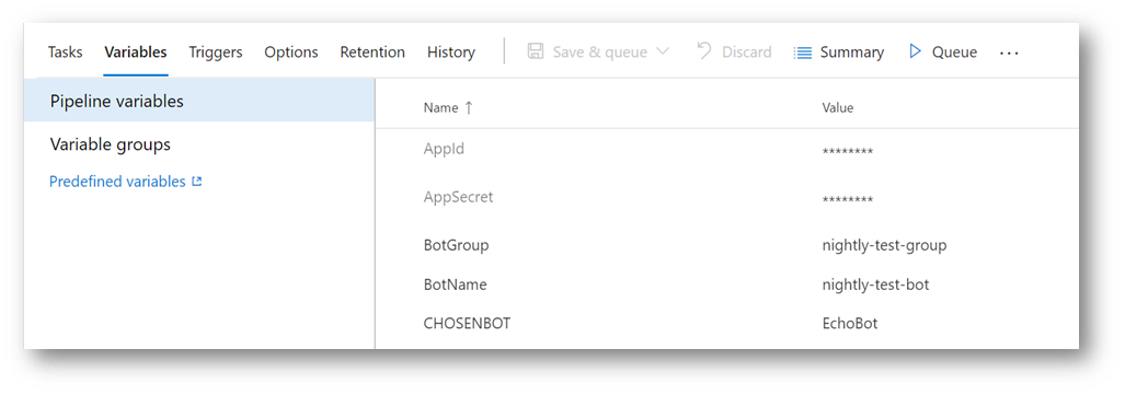 1- Define five environment variables: AppId, AppSecret, BotName, BotGroup and CHOSENBOT and mark the first two as Secrets.