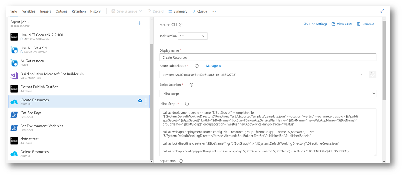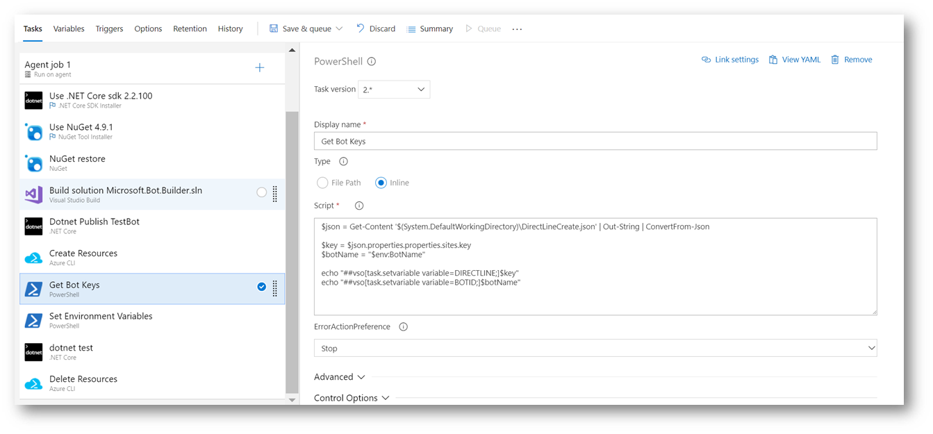 4- Add a new PowerShell Script Task to read the json file generated in the previous step and get the secret key to connect to the bot. It also sets an environment variable with this value.