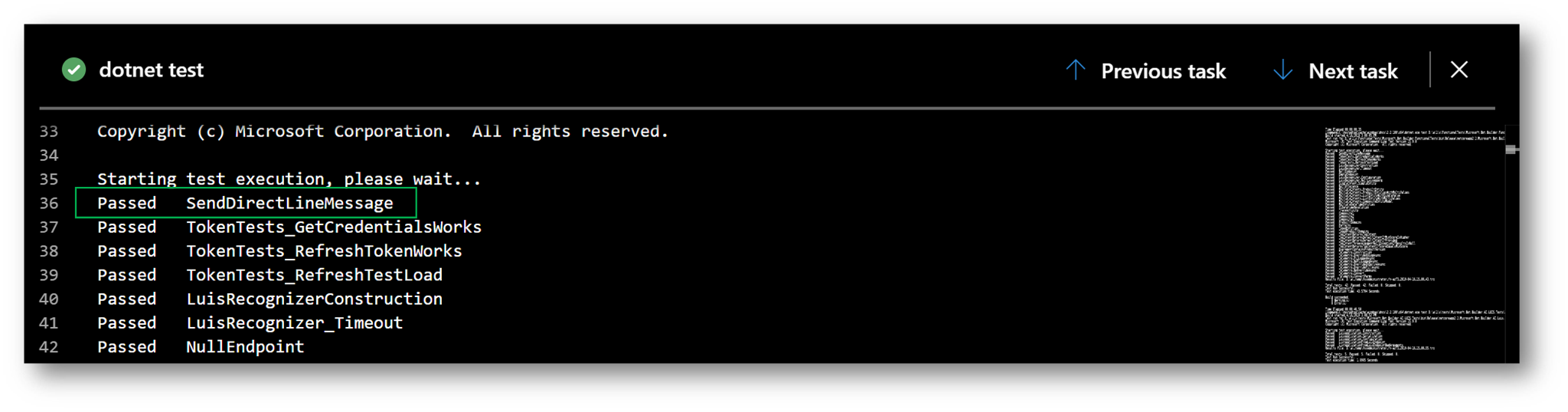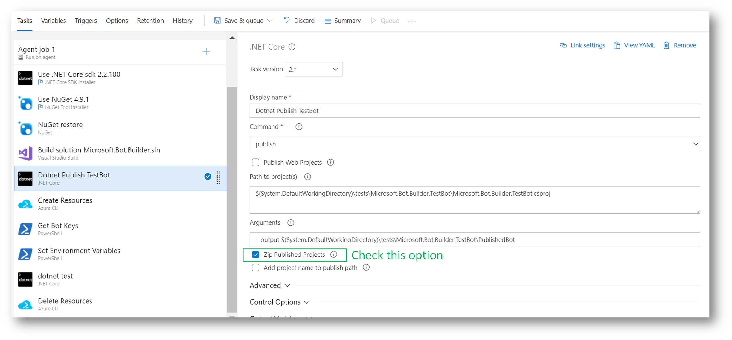 2- Add a Dotnet Task to publish the Test Bot project and leave it as a zip in a folder named PublishedBot.